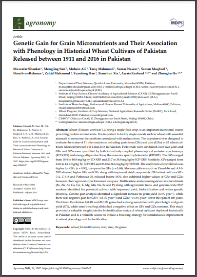 Genetic gain for grain micronutrients and their association with phenology in historical wheat cultivars of Pakistan released between 1911 and 2016 in Pakistan